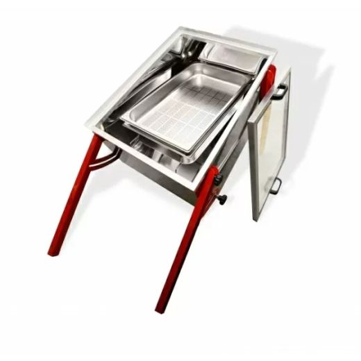 Чрез промяна на ъгъла на предните крака благодарение на практичните странични копчета, топилката за слънчев восък бързо се превръща на маса за разпечатване на пчелни пити . Във ваната за разпчечатване има дървена напречна греда с процеп, където е възможно да се постави ножът за отваряне, докато се обработват рамките. ОСНОВНИ ПРЕДИМСТВА • Хранителна неръждаема стомана за професионална употреба •