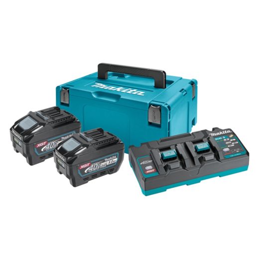 Комплект от новата серия MAKITA XGT. Доставя се с две акумулаторни батерии MAKITA BL4050 с напрежение 40V и капацитет 5.0Ah + двойно бързозарядно устройство MAKITA DC40RB.