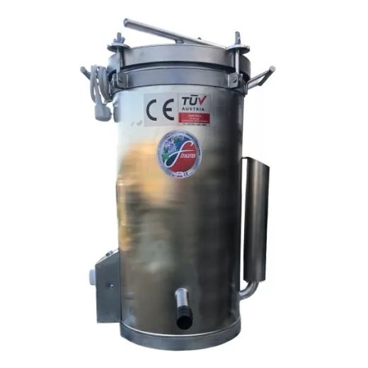 С водна риза, в която се налива вода, кошница от перфорирана ламарина и капака с винтова преса.